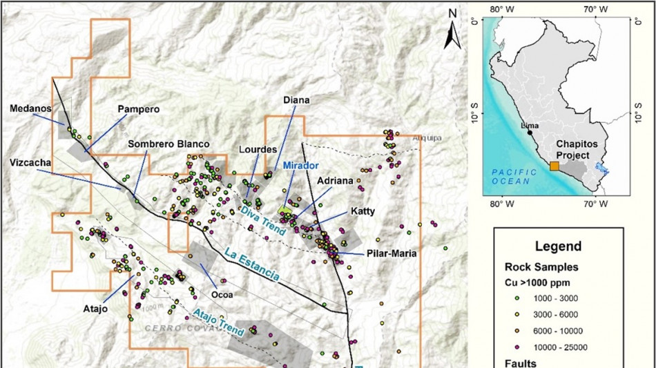 VANCOUVER, BC / ACCESS Newswire / July 16, 2025 / Camino Minerals Corporation (TSXV:COR)(OTC PINK:CAMZF) ("Camino" or the "Company") is pleased to announce high‐grade copper trench results from the Mirador prospect located in the Diva trend, one of several prospective targets at the Company's Los Chapitos Copper Project ("Los Chapitos" or the "Project") in Peru. The new mineralized body identified at Mirador could represent the northwesterly continuation of the Adriana mineralized copper zone where over 20,000 meters of drilling has been completed. There are clear lithological, mineralogical, and structural similarities observed at Adriana, Mirador, and Katty that share the same structural control across the Diva trend fault. Importantly, this primary and oxide copper surface exposure mineralization is within intrusive, potential source rocks, that typically underlay the volcanic Chocolate Formation. The package of volcanic Chocolate formation above exhibits more copper oxide manto style mineralization that may extend to the east and to depth (Figure 1). Camino is taking more samples and opening the ground with bulldozers to expose more bedrock, leading to more assay results in the coming weeks. A planned drilling campaign is likely to commence in September 2025. High-grade copper with bornite trench results are summarized in Table 1.