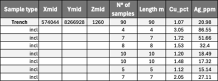 Table 1. Summary of the trench sampling in the Mirador Zone, direction NW-N and best intercepts of copper and silver (see the Figure 4, left)