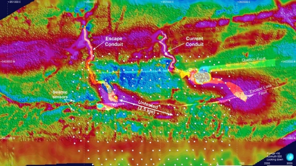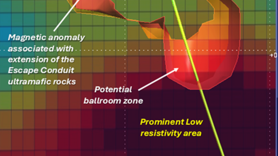 Figure 2. Location of newly identified 'ballroom-type' coincident magnetic and conductivity anomalies within the modelled down-plunge extension of the Escape Deposit.