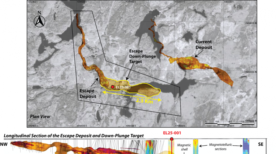 Figure 1. Plan view and longitudinal sections of the Escape Deposit and Down-Plunge Target illustrating the mineralized intercepts in drill hole EL25-001 relative to the modelled extension of the known resource. Also shown are the locations of untested magnetic and conductive anomalies distributed along the 2.5-kilometre highly prospective mineralized conduit.