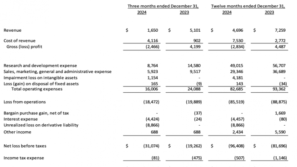 Der Umsatz im vierten Quartal 2024 betrug 1,7 Millionen $ verglichen mit 5,1 Millionen $ im vierten Quartal 2023. Ohne den einmaligen Umsatz von Microsoft in Höhe von 4,6 Millionen $ im 4. Quartal 2023 war das Umsatzwachstum im vierten Quartal 2024 vor allem auf die Nachfrage von Industriekunden zurückzuführen. Die Umsätze im 4. Quartal blieben hinter unseren Erwartungen zurück, da ein Kundenauftrag ins Jahr 2025 verschoben wurde.