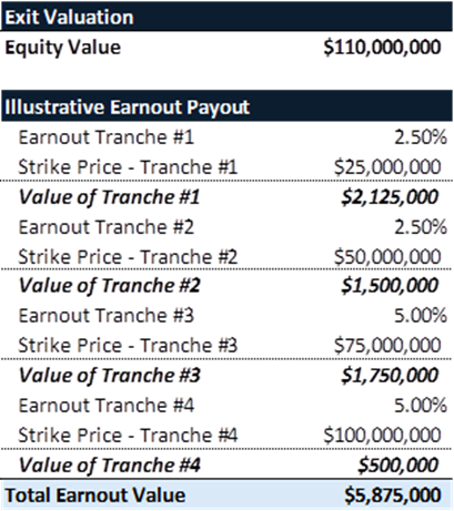 Im Folgenden finden Sie ein Beispiel für die Berechnung der Earnout-Einnahmen des Unternehmens bei einem Verkaufsereignis, bei dem der Eigenkapitalwert der neuen Muttergesellschaft 110 Millionen $ beträgt.