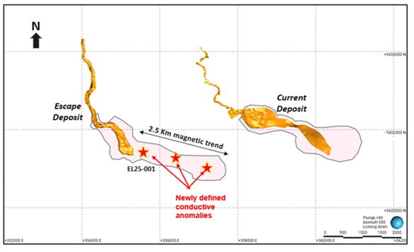 Im August hat das Unternehmen die erste einer Reihe von geophysikalischen Zielzonen in der modellierten Abwärtserweiterung der Lagerstätte Escape bohrtechnisch untersucht (siehe Pressemeldung vom 22. Juli 2025). Diese Zielzonen wurden innerhalb einer 2,5 km langen magnetischen Anomalie ausgewählt, die stellenweise mit den vor kurzem definierten Konduktivitätsanomalien zusammenfällt (Abbildung 1).